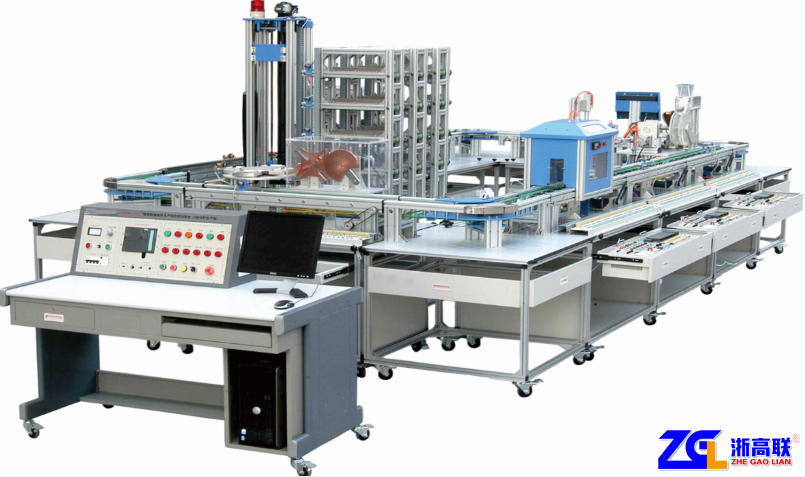 本实训系统是一种典型的环形柔性自动生产线(规格:5m×3m),它由落料单元、喷涂烘干单元、加盖单元、穿销单元、检测单元、分拣输送单元、物流仓储单元、行车机械手单元组成。传输链有辊道、皮带、链条滚轮三种模式,配有相应的圆带、滚筒、直角转向等转角,通过传输链和转角连成环形生产线。上述机构均安装在工业型材桌面上,系统中的机械结构、电气控制回路、执行机构完全独立,采用工业标准件设计,便于拆、装。